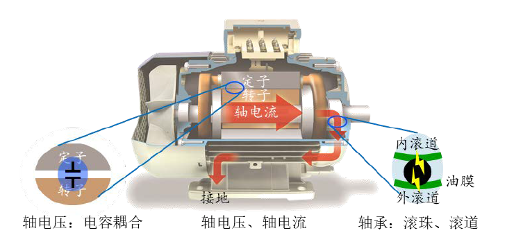 軸電壓/軸電流產(chǎn)生的原因:磁不平衡產(chǎn)生軸電壓;變頻電源供電產(chǎn)生軸電壓——零序電壓分量(共模電壓);靜電感應(yīng)產(chǎn)生軸電壓;外部電源的介入產(chǎn)生軸電壓
